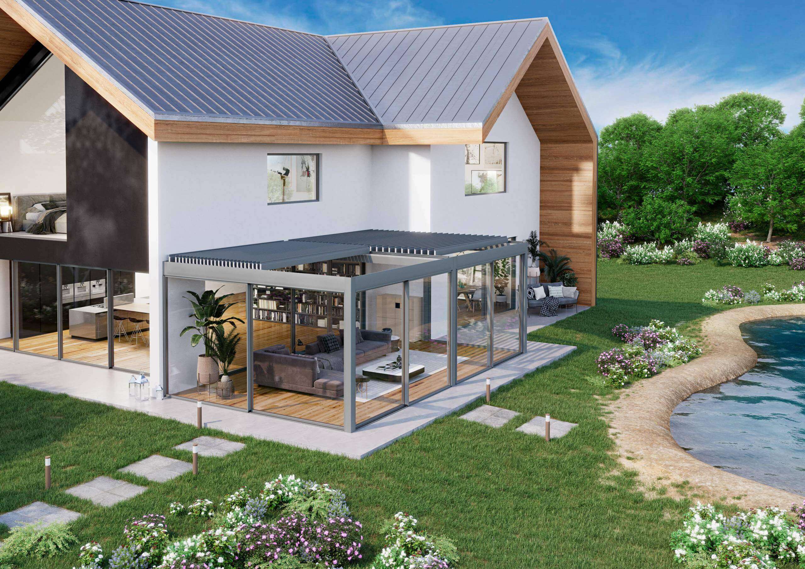 • Boční stínění: ZIP screeny (větruodolné), případně posuvné zasklení.