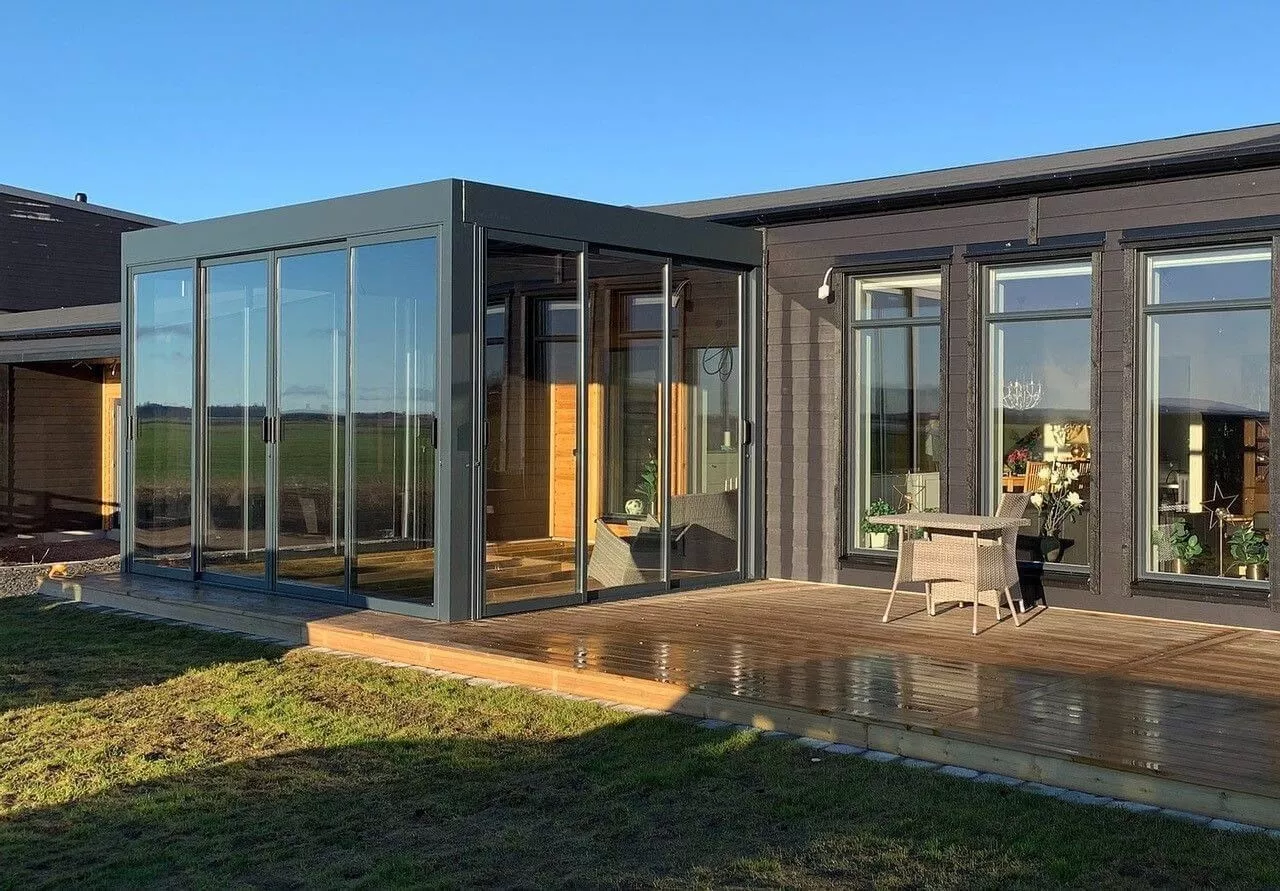 Zimní zahrada tak působí jako logické prodloužení obýváku. Výhodou je snadné propojení s pergolami nebo plně zasklenými systémy.
