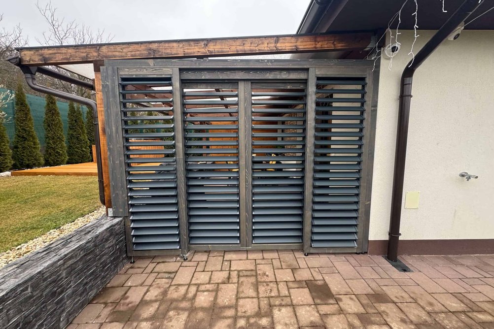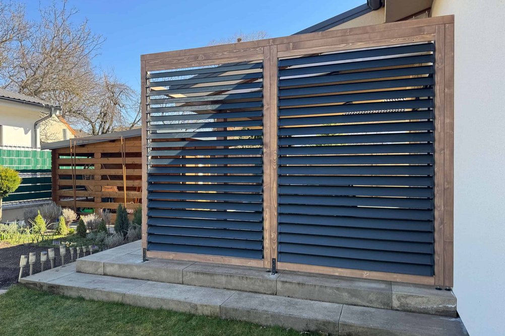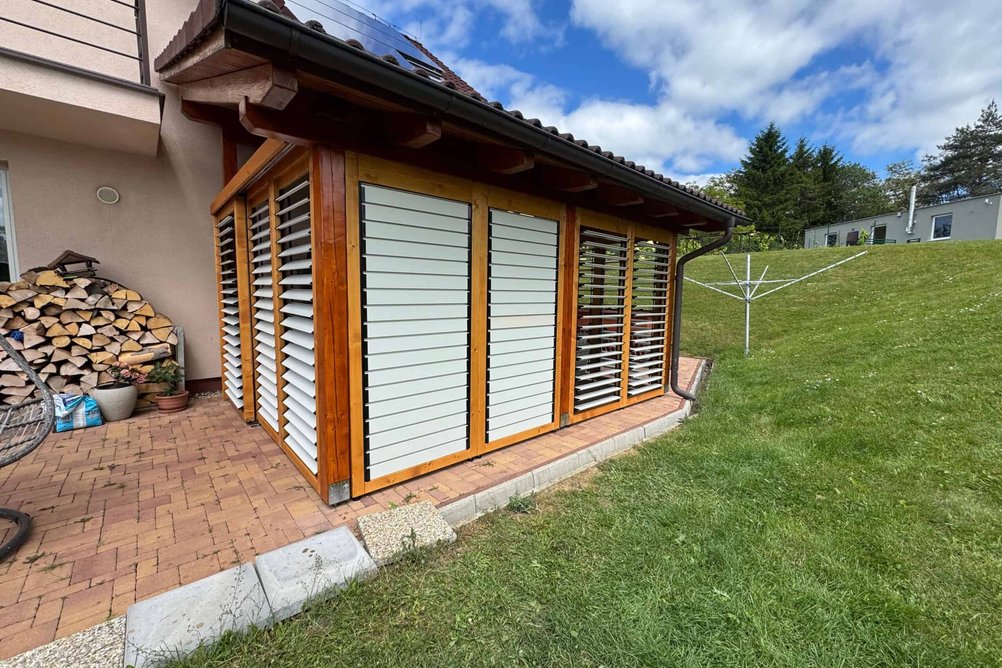 Otočné žaluzie s dřevěným rámem a hliníkovými lamelami kombinují teplo přírodního materiálu s odolností kovu. Ideální volba pro přístřešky, terasy a altánky, kde hledáte stylové a funkční stínění s dlouhou životností.