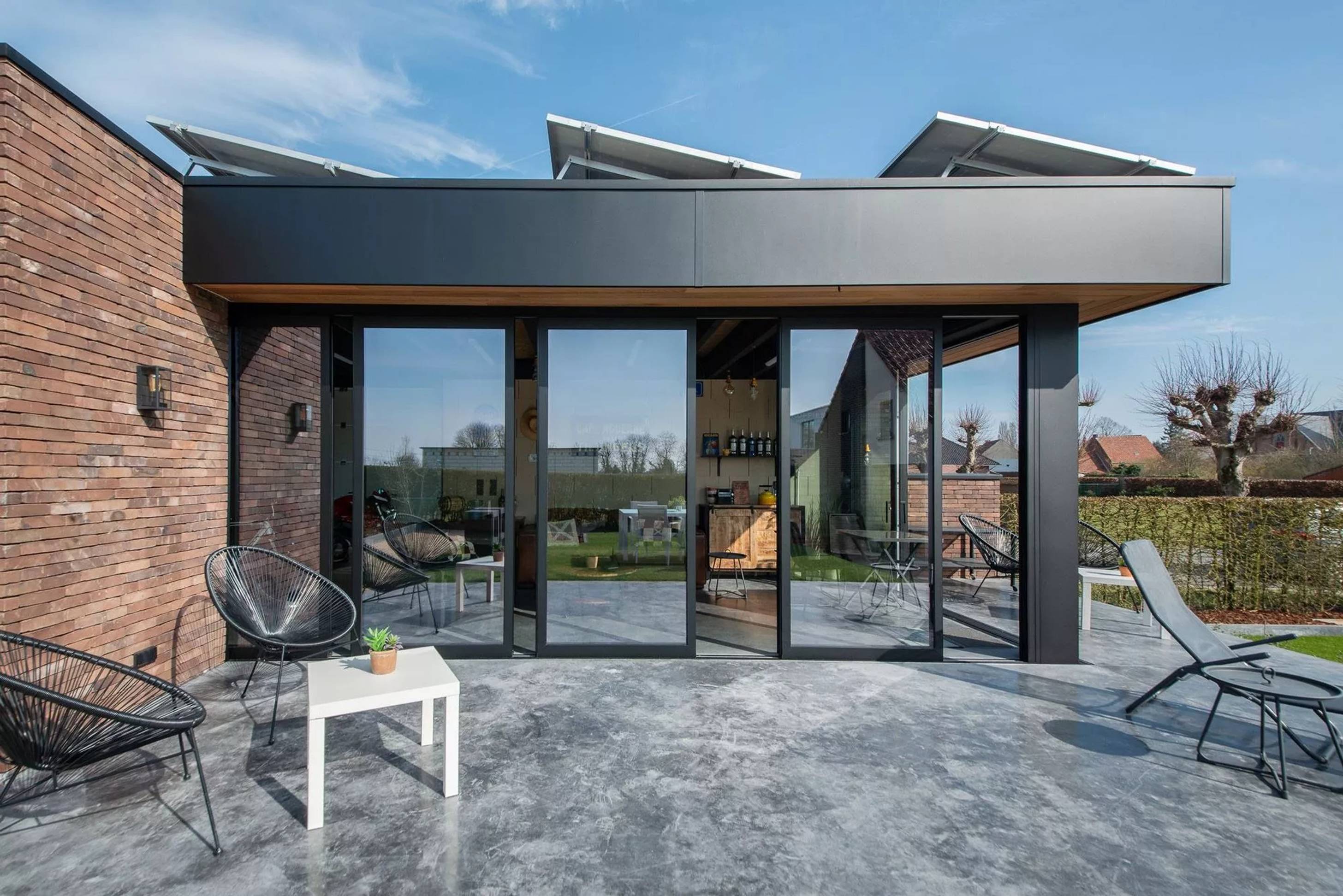 Posuvné a dvoukřídlé dveře přirozeně propojují interiér s exteriérem a dodávají stavbě vzdušnost i eleganci.