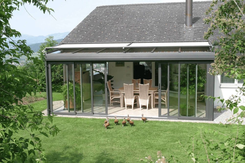 Zasklení s dvojskly a hliníkovou konstrukcí zajišťuje odolnost vůči povětrnostním vlivům a vytváří chráněný prostor pro celoroční využití.
