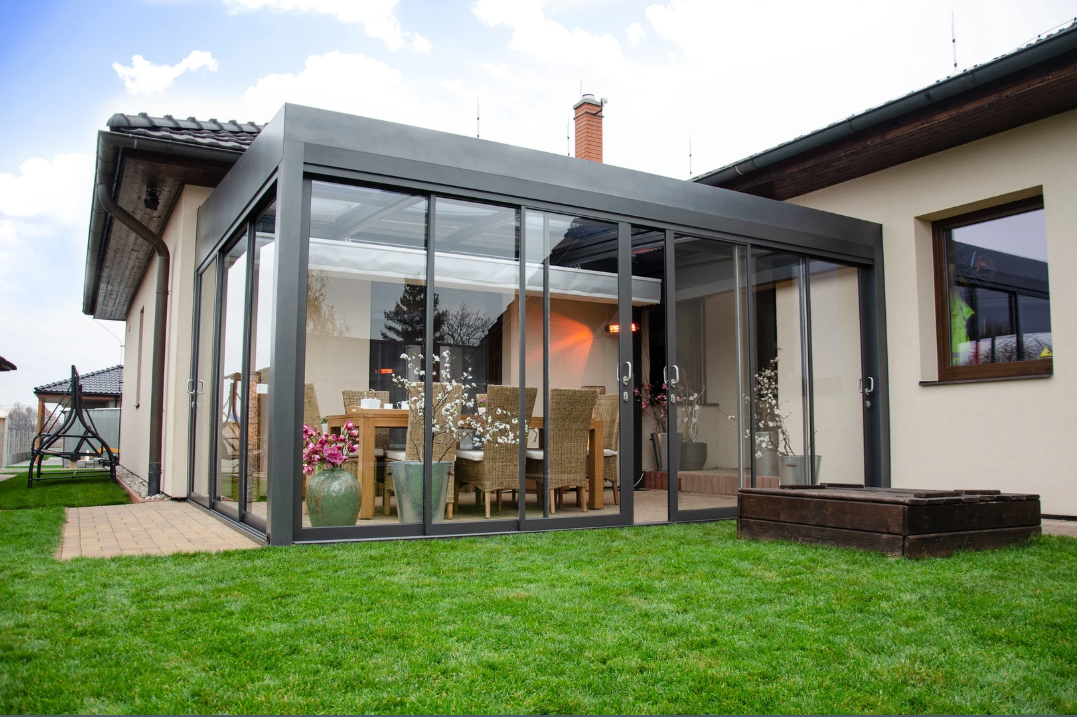 - boční zasklení (posuvné či rámové systémy), které pergolu promění v částečně nebo plně chráněnou „venkovní místnost“.